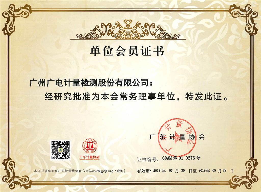 廣東計(jì)量協(xié)會常務(wù)理事單位會員證書