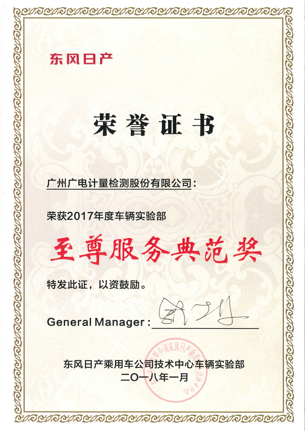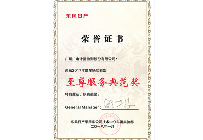 東風日產2017年度車輛實驗部至尊服務典范獎