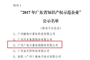 廣電計量入選“2017年度廣東省知識產(chǎn)權(quán)示范企業(yè)”名單