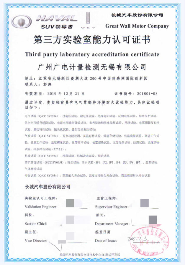 無錫子公司獲得長城汽車電氣零部件環(huán)境耐久試驗(yàn)授權(quán)認(rèn)可