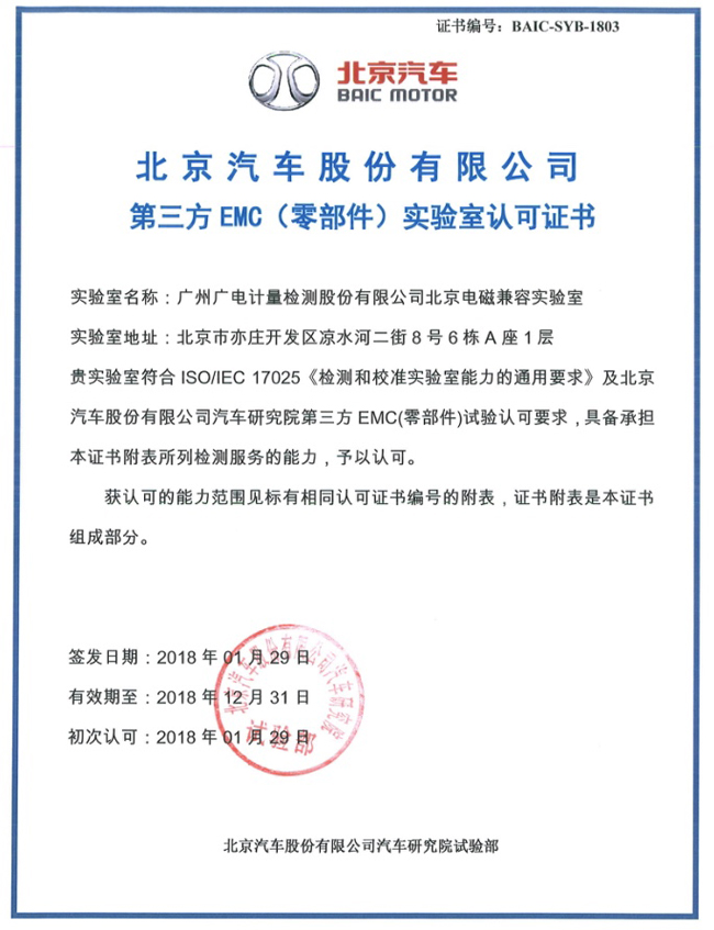 北京檢測基地電磁兼容實(shí)驗(yàn)室獲得北京汽車第三方EMC(零部件)實(shí)驗(yàn)室認(rèn)可