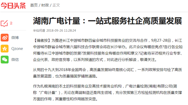 9月27日,權(quán)威媒體《長沙晚報(bào)》對(duì)湖南廣電計(jì)量在科技服務(wù)領(lǐng)域的做法與經(jīng)驗(yàn)進(jìn)行了詳細(xì)報(bào)道,今日頭條、政府部門網(wǎng)站等紛紛轉(zhuǎn)載報(bào)道,形成了廣泛的影響力。