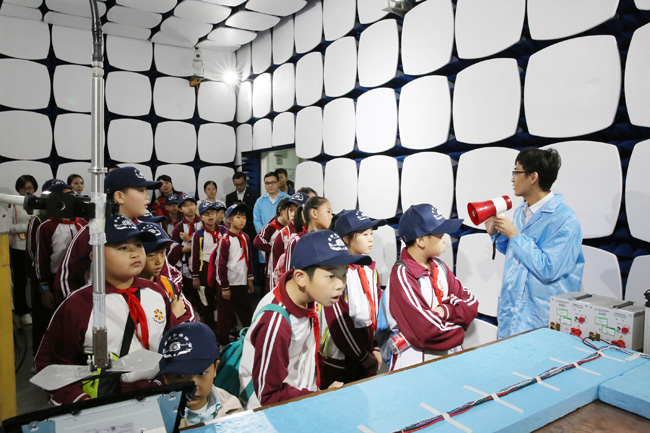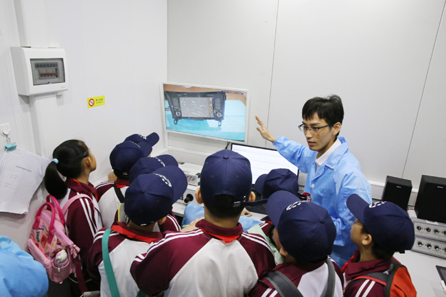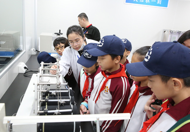 隨后,小記者團(tuán)來到計(jì)量校準(zhǔn)、電磁兼容檢測(cè)、化學(xué)分析、可靠性與環(huán)境試驗(yàn)等實(shí)驗(yàn)室,觀看了紡織品檢測(cè)、車載導(dǎo)航抗輻射電磁干擾試驗(yàn)、汽車座椅測(cè)試等過程演示。面對(duì)陌生的儀器設(shè)備,孩子們化身“好奇寶寶”,紛紛舉手與技術(shù)人員交流互動(dòng)。
