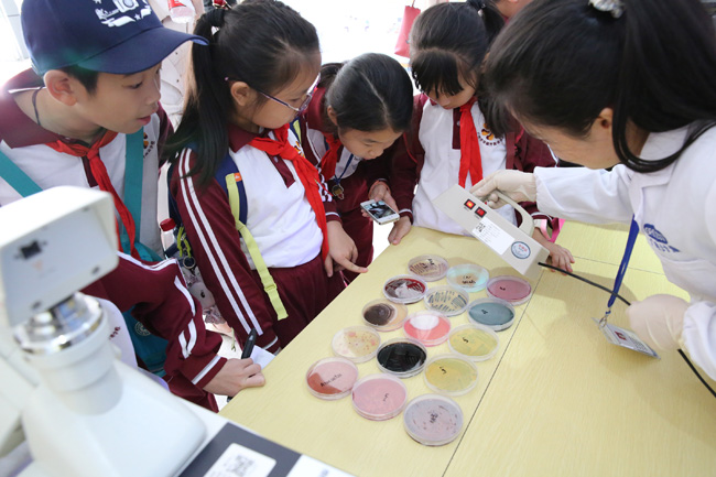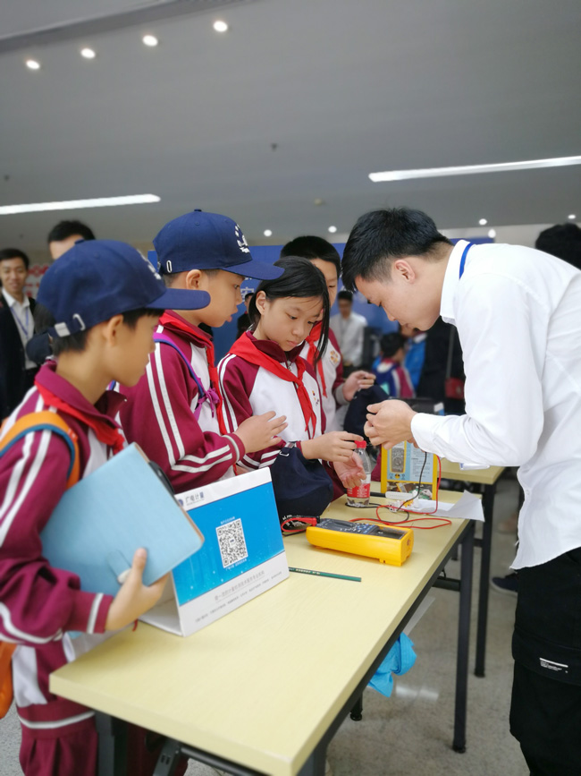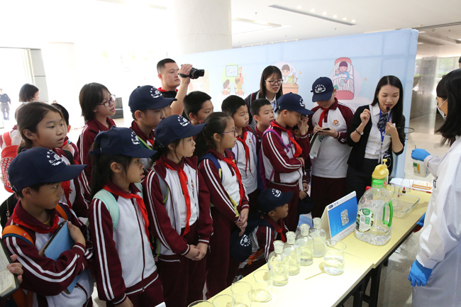 走進(jìn)互動(dòng)體驗(yàn)區(qū),接地氣的宣傳展板和各種有趣好玩的小實(shí)驗(yàn)頓時(shí)吸引了小記者們的目光。瞬間變色實(shí)驗(yàn)、火山噴發(fā)實(shí)驗(yàn)、手機(jī)電磁輻射檢測(cè)……孩子們目不轉(zhuǎn)睛地盯著技術(shù)人員的操作,現(xiàn)場(chǎng)不時(shí)傳出陣陣驚嘆。