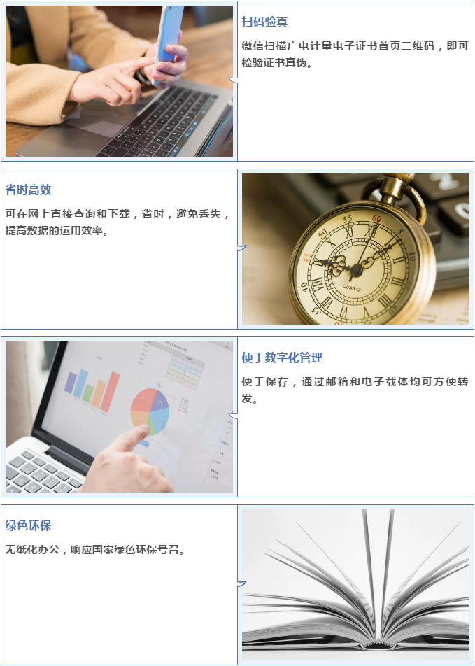 為便于客戶數據管理和查詢證書信息有效性,適應“互聯網+計量”的逐步推廣以及計量檢測信息化的發展需要,廣電計量依靠自身信息化建設能力,全面推行電子證書,確保質量信息真實、便捷、高效傳遞。今后,客戶可通過計量E管家、自助服務平臺、官網、公眾號等渠道自行查詢和下載使用,并可通過掃描證書二維碼查詢防偽信息。