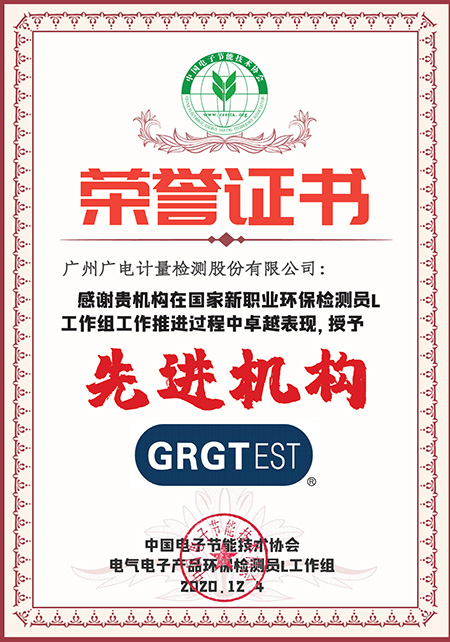 廣州廣電計(jì)量檢測股份有限公司(簡稱廣電計(jì)量)作為中國 RoHS 標(biāo)準(zhǔn)工作組技術(shù)成員單位及中國電子節(jié)能技術(shù)協(xié)會電器電子綠色制造專委會副主任委員單位,出席此次培訓(xùn)班及國家新職業(yè)工作組推進(jìn)實(shí)施工作會議,獲頒“電氣電子產(chǎn)品環(huán)保檢測員 L”工作組“先進(jìn)機(jī)構(gòu)”榮譽(yù)稱號。