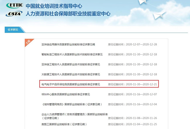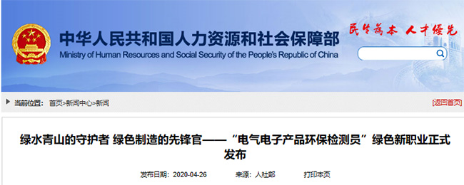 2020年 2月 25日,人社部,國家統(tǒng)計(jì)局,市場監(jiān)督管理總局聯(lián)合向社會發(fā)布了 16 個新職業(yè)。其中,“電氣電子產(chǎn)品環(huán)保檢測員”作為“綠色職業(yè)”被正式納入國家職業(yè)分類目錄。