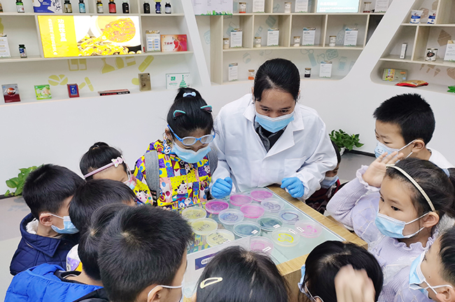 細(xì)菌長什么樣?通過觀看顏色、外觀各異的細(xì)菌培養(yǎng)皿,技術(shù)人員向?qū)W生強(qiáng)調(diào)要養(yǎng)成講衛(wèi)生的好習(xí)慣。