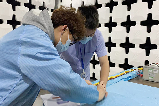 在一分一秒流逝的時(shí)間面前,居住在非封控管理小區(qū)的上海子公司黨支部黨員、電磁兼容檢測(cè)實(shí)驗(yàn)室主任瞿軍早上接到消息后顧不上仔細(xì)收拾,立即主動(dòng)趕至公司協(xié)調(diào)測(cè)試排期;同時(shí)通過(guò)電話、微信群聯(lián)系可值班員工趕回公司,迅速集結(jié)起一支攻堅(jiān)小組。這意味著他們?cè)谝欢螘r(shí)間內(nèi)將始終留在公司不能回家,等于主動(dòng)放棄了與家人團(tuán)聚的機(jī)會(huì)。