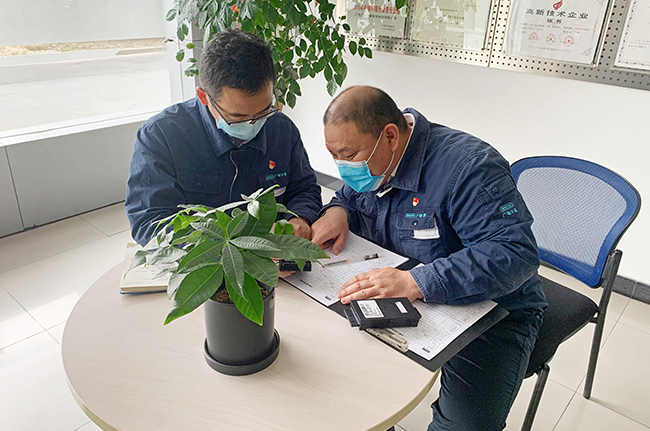 上海子公司黨支部書(shū)記、可靠性與環(huán)境試驗(yàn)實(shí)驗(yàn)室副主任龐威(左)與瞿軍討論疫情防護(hù)工作