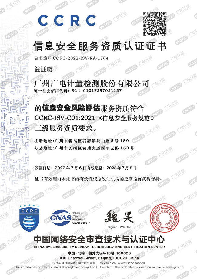 ? ? ? ? 7月6日,廣州廣電計量檢測股份有限公司(簡稱“廣電計量”,002967.SZ)經(jīng)過嚴格審查,獲得中國網(wǎng)絡安全審查技術與認證中心(CCRC)頒發(fā)的信息安全服務資質認證證書,成為信息安全風險評估服務機構,實現(xiàn)了公司在信息安全服務領域的重要突破。