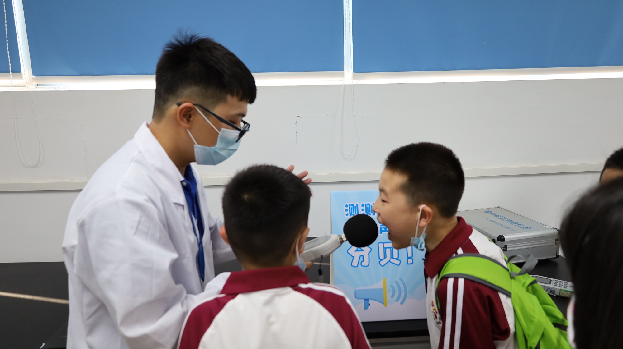 聲音分貝測試環(huán)節(jié),小學(xué)生們排隊(duì)依次體驗(yàn)不同強(qiáng)度聲音的分貝數(shù)值