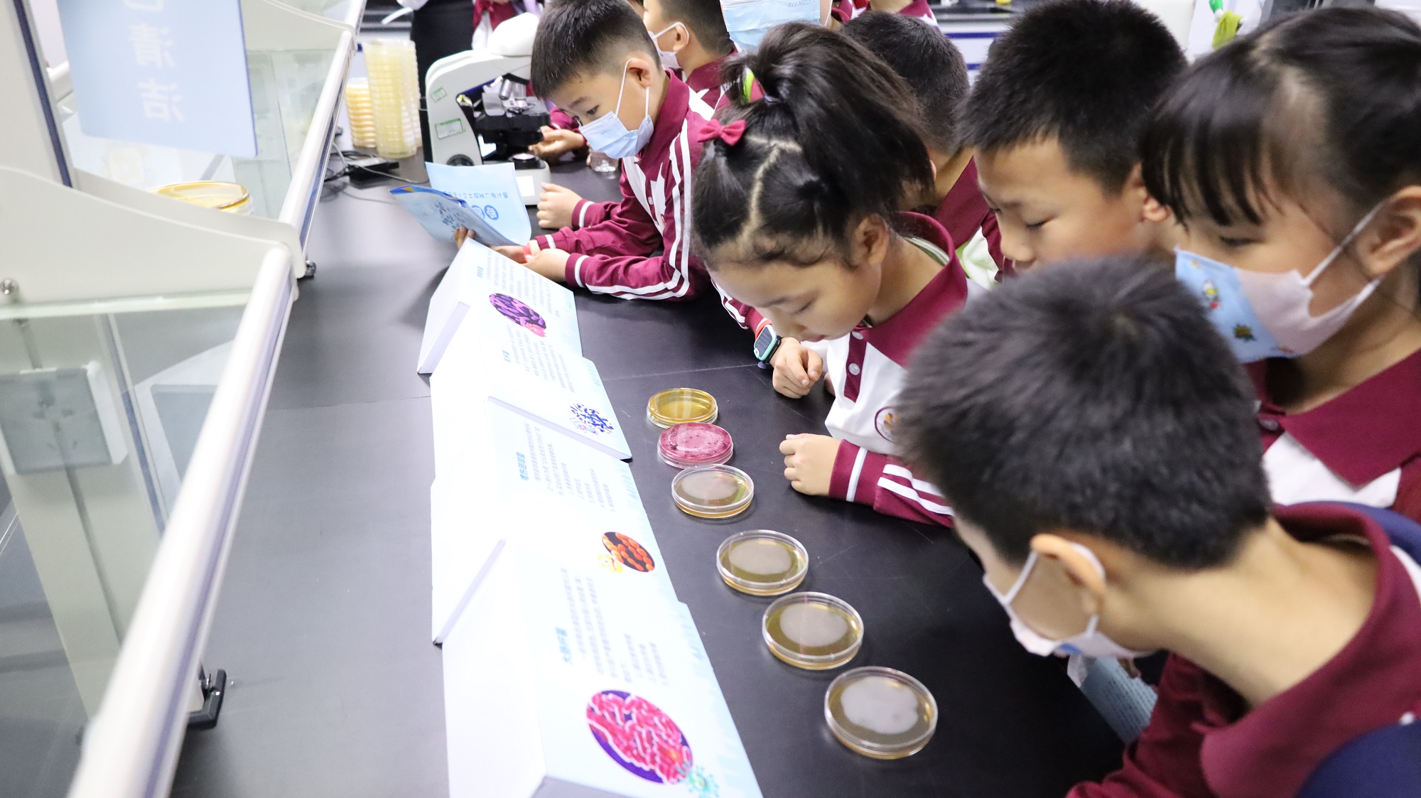 微生物觀測環(huán)節(jié),小學(xué)生們認(rèn)真觀測細(xì)菌培養(yǎng)皿,并通過顯微鏡看到細(xì)菌的“真面目”