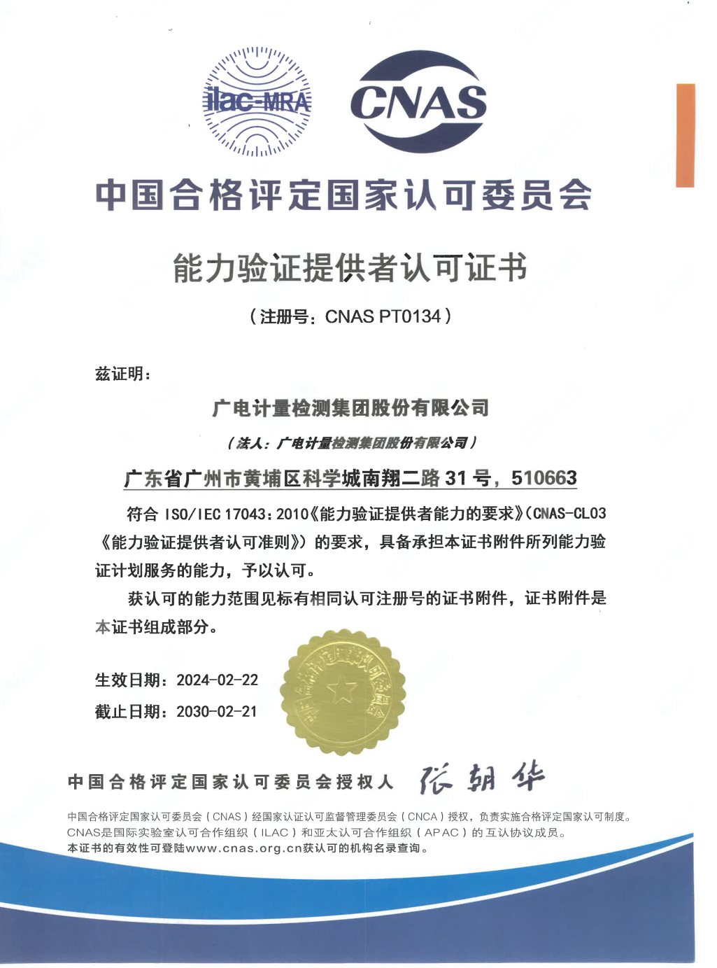 能力驗證是利用實驗室間比對評價參加者能力的一項活動,也是檢驗檢測機構證明和提高技術能力的重要手段。取得CNAS能力驗證提供者認可資質,標志著廣電計量有能力獨立實施相關能力驗證活動,可以為政府監管、企事業單位質量控制提供更加專業的檢驗檢測能力評價服務。