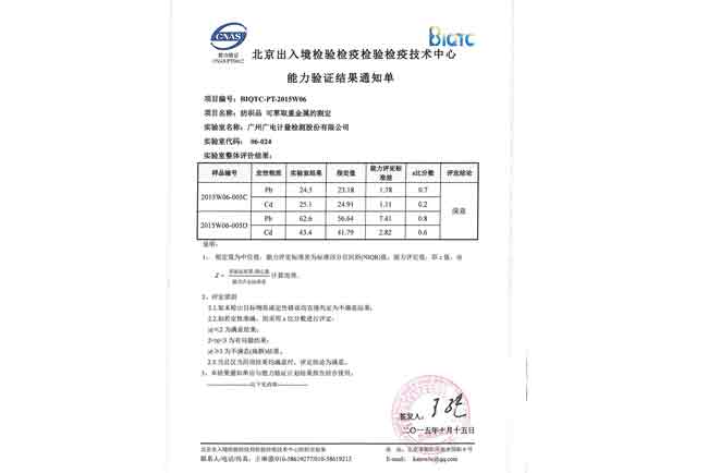 GRGT近期收到北京出入境檢驗檢疫局檢驗檢疫技術中心關于“BIQTC-PT-2015W06 紡織品 可萃取重金屬的測定”能力驗證計劃結果通知單和報告,結果顯示GRGT化學分析測試中心檢測結果的Z比分數值全部小于0.8,結果優異,順利通過本次能力驗證。