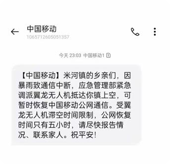 “7月21日,應急管理部緊急調派翼龍無人機空中應急通信平臺,跨區域長途飛行,歷時4.5個小時抵達鞏義市,18時21分進入米河鎮通信中斷區,利用翼龍無人機空中應急通信平臺搭載的移動公網基站,實現了約50平方公里范圍長時穩定的連續移動信號覆蓋。截止20時,空中基站累計接通用戶2572個,產生流量1089.89M,單次最大接入用戶648個,為災區居民及時報告災情、報送平安恢復了移動公網信號,打通了應急通信保障生命線。”