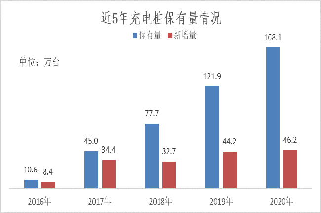 與此同時,近五年充電樁的保有量也在持續增長,截至2020年12月,全國公共充電樁和私人充電樁總計保有量為168.1萬臺,同比增長37.9%。其中,充電聯盟成員單位的公共類充電樁約80.7萬臺,私有充電樁約87.4萬臺,產業發展迅速。