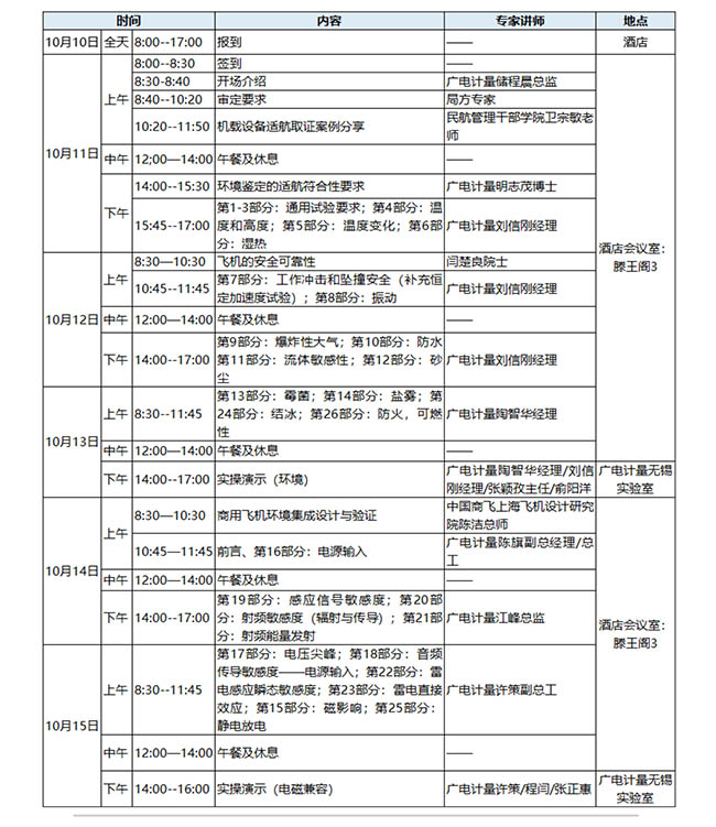 為幫助民航機載設備適航管理設計、試驗測試等人員提高對標準的認識水平,廣電計量將于10月11-15日在無錫舉辦RTCA DO-160G《機載設備環境鑒定和試驗程序》標準培訓,通過基本技術內容、試驗案例和實際操作演示相結合的方式,為參訓人員提供全面、深入的試驗標準解讀以及與需求、設計、適航和技術標準規定(TSO/ETSO/CTSO)相適合的全局理解。