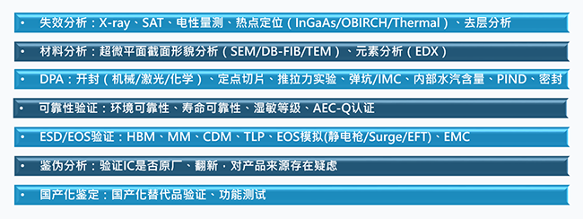 廣電計量集成電路失效分析實驗室,配備完善的EOS/ESD/RA等測試設備及完整的失效分析手法,擁有經驗豐富的材料及電性能可靠性專家,可以針對IC進行全方位的失效分析及可靠性驗證方案的設計與執行。