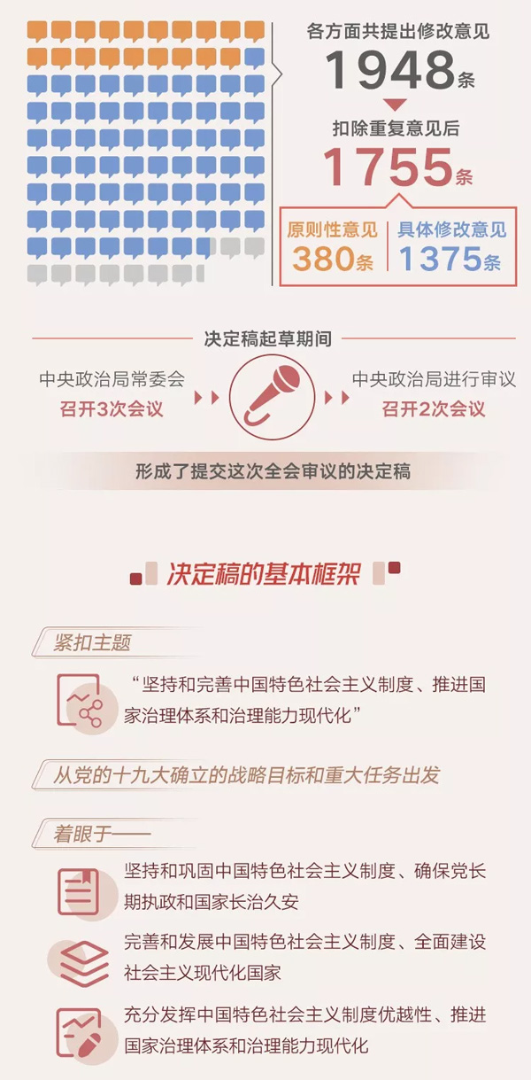 決定稿總體考慮是,緊扣“堅持和完善中國特色社會主義制度、推進國家治理體系和治理能力現(xiàn)代化”這個主題,從黨的十九大確立的戰(zhàn)略目標(biāo)和重大任務(wù)出發(fā),著眼于堅持和鞏固中國特色社會主義制度、確保黨長期執(zhí)政和國家長治久安,著眼于完善和發(fā)展中國特色社會主義制度、全面建設(shè)社會主義現(xiàn)代化國家,著眼于充分發(fā)揮中國特色社會主義制度優(yōu)越性、推進國家治理體系和治理能力現(xiàn)代化,全面總結(jié)黨領(lǐng)導(dǎo)人民在我國國家制度建設(shè)和國家治理方面取得的成就、積累的經(jīng)驗、形成的原則,重點闡述堅持和完善支撐中國特色社會主義制度的根本制度、基本制度、重要制度,部署需要深化的重大體制機制改革、需要推進的重點工作任務(wù)。