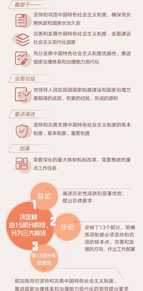 決定稿由15部分構(gòu)成,分為三大板塊。第一板塊為第一部分,是總論,主要闡述中國特色社會主義制度和國家治理體系發(fā)展的歷史性成就、顯著優(yōu)勢,提出新時代堅持和完善中國特色社會主義制度、推進國家治理體系和治理能力現(xiàn)代化的重大意義和總體要求。第二板塊為分論,聚焦堅持和完善支撐中國特色社會主義制度的根本制度、基本制度、重要制度,安排了13個部分,明確了各項制度必須堅持和鞏固的根本點、完善和發(fā)展的方向,并作出工作部署。第三板塊為第十五部分和結(jié)束語,主要就加強黨對堅持和完善中國特色社會主義制度、推進國家治理體系和治理能力現(xiàn)代化的領(lǐng)導(dǎo)提出要求。