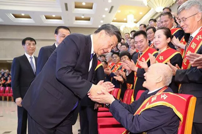 2019年7月26日,習近平在北京會見了全國退役軍人工作會議全體代表。合影留念時,一名94歲的老人坐在了習近平與李克強中間。