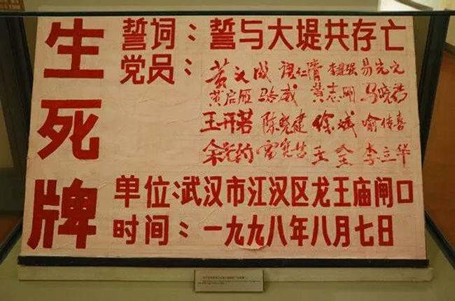 2016年夏天,武漢再次遭遇洪澇災害,當年在“生死牌”上簽上名字,如今已年過半百的唐仁清、李建強再次擔起值守龍王廟的重任,他們和其他7名黨員又立下了“人在堤在,誓與大堤共存亡”的“生死牌”。