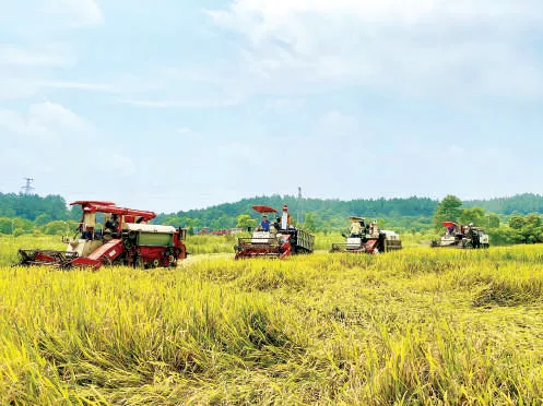 防汛期間,江西進賢縣組織黨員搶修隊幫助農民搶收水稻。